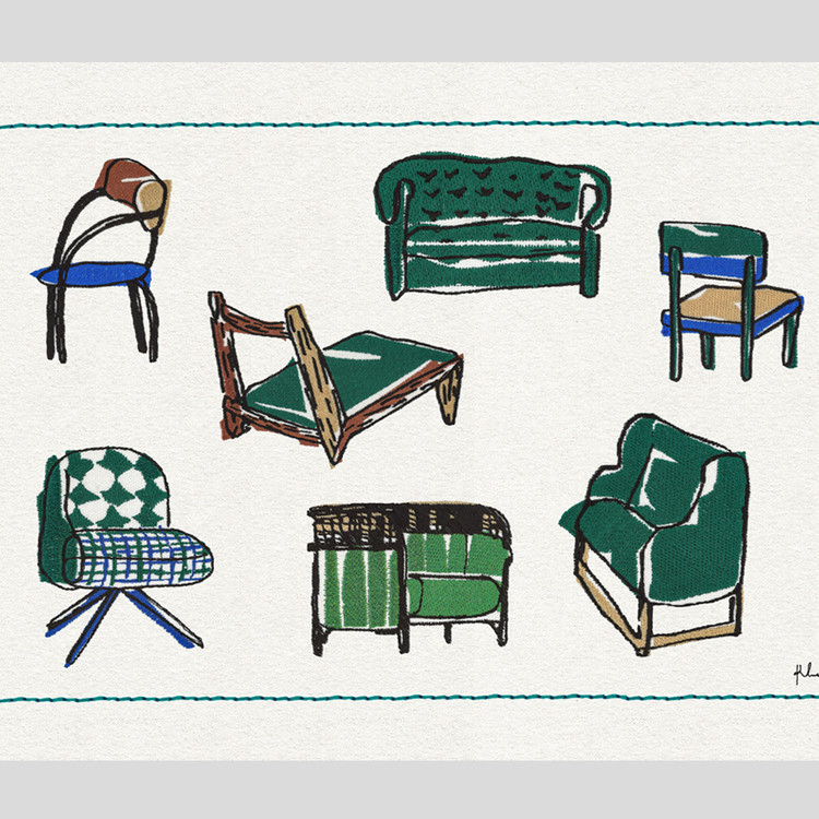 초록색 의자를 자수로 그린 그림을 담은 포스터입니다.