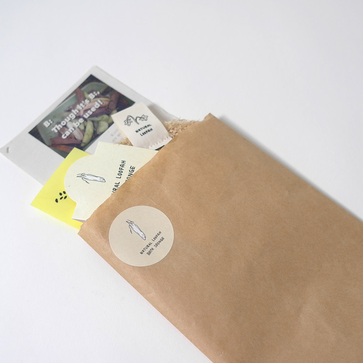 수세미에 달린 패브릭 태그는 자투리 천을 수세미 잎과 껍질을