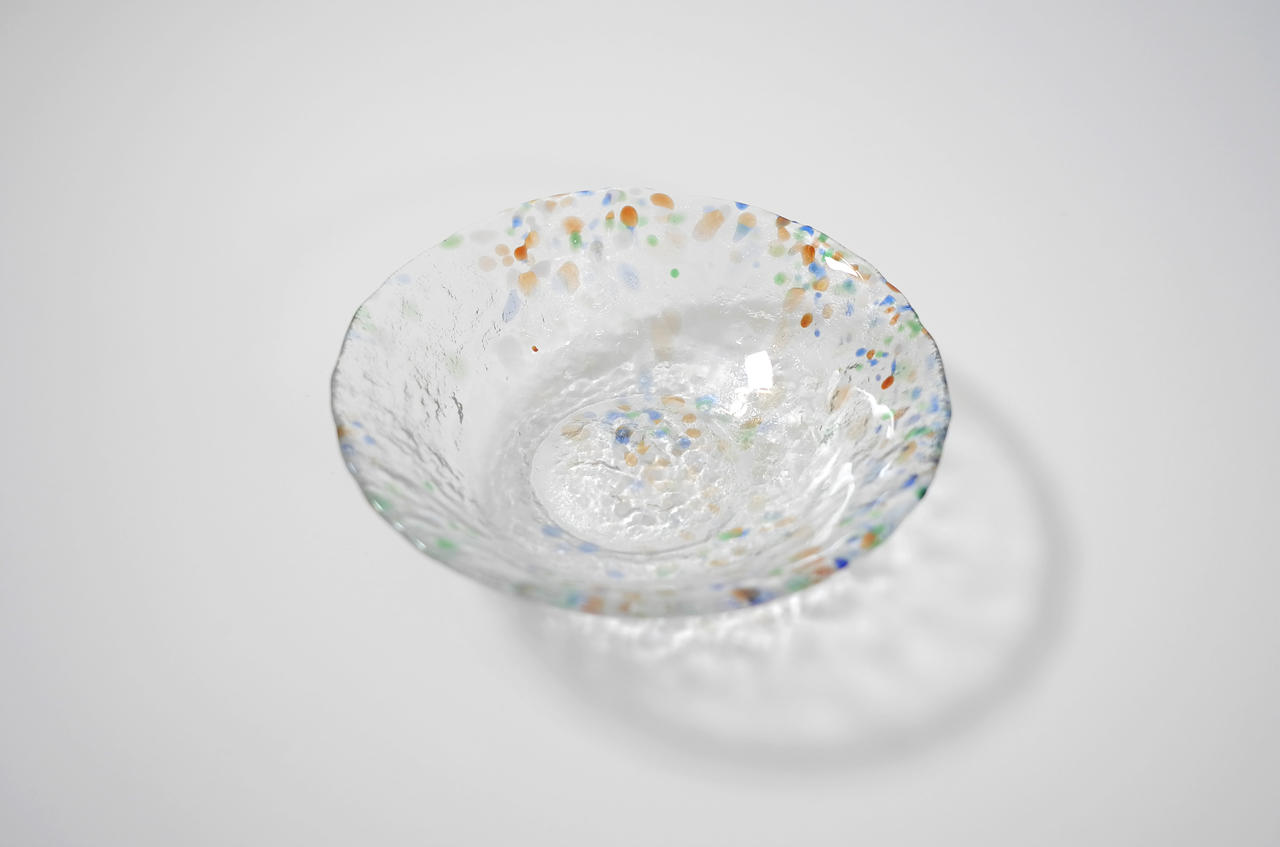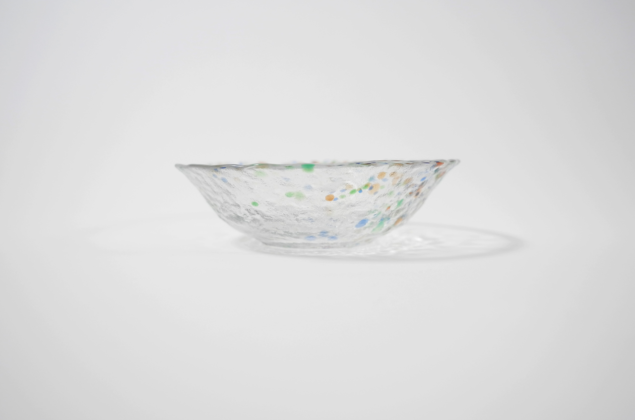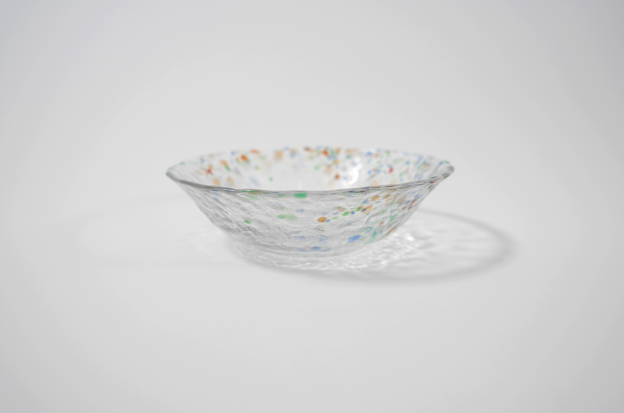토트 패턴이 눈에 띄는 유리 접시입니다.