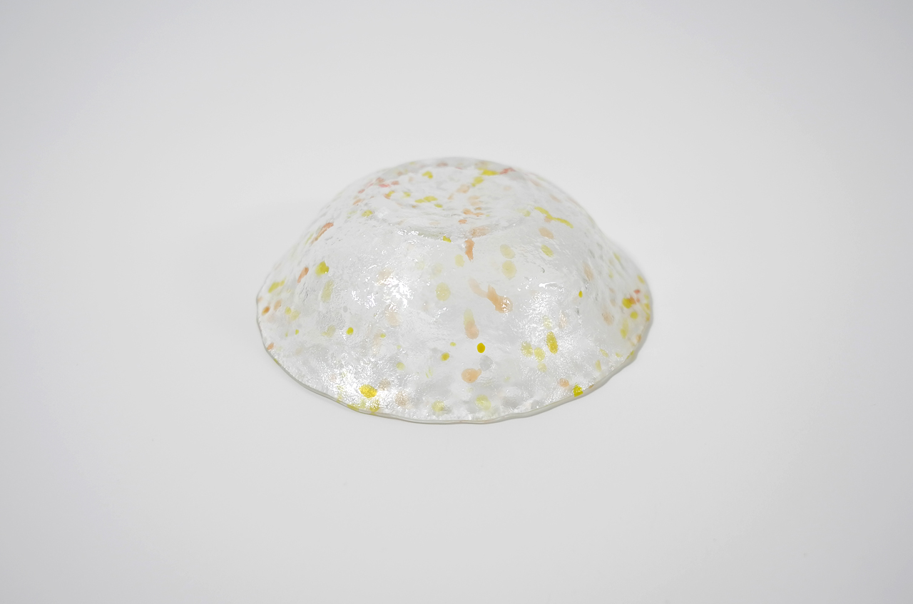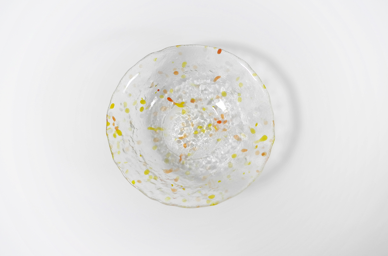 토트 패턴이 눈에 띄는 유리 접시입니다.