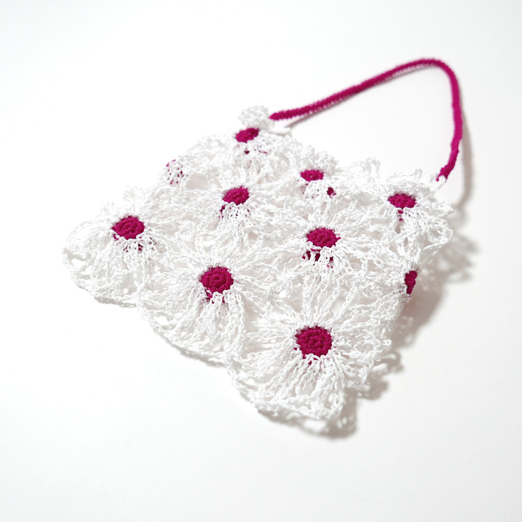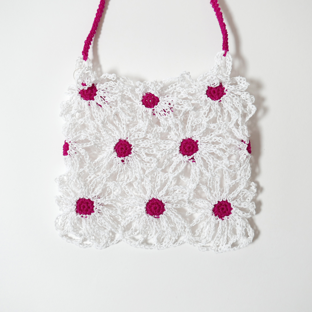 하얀 데이지 꽃과 진 분홍 꽃술의 아름다운 가방입니다.