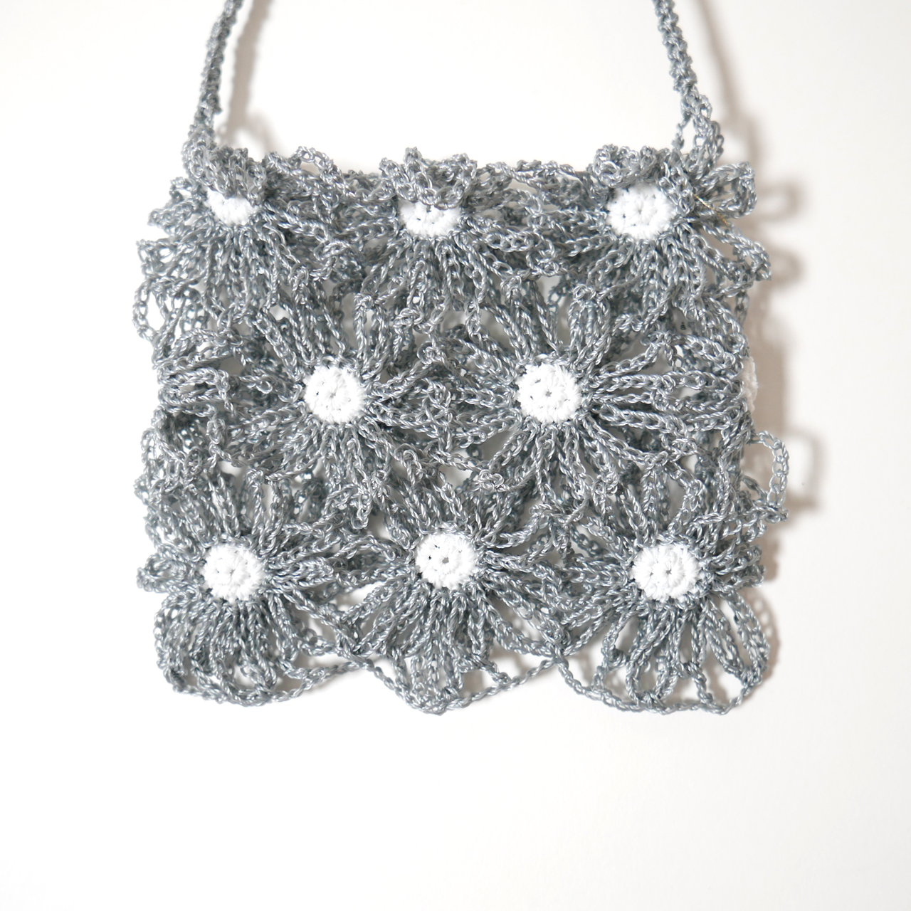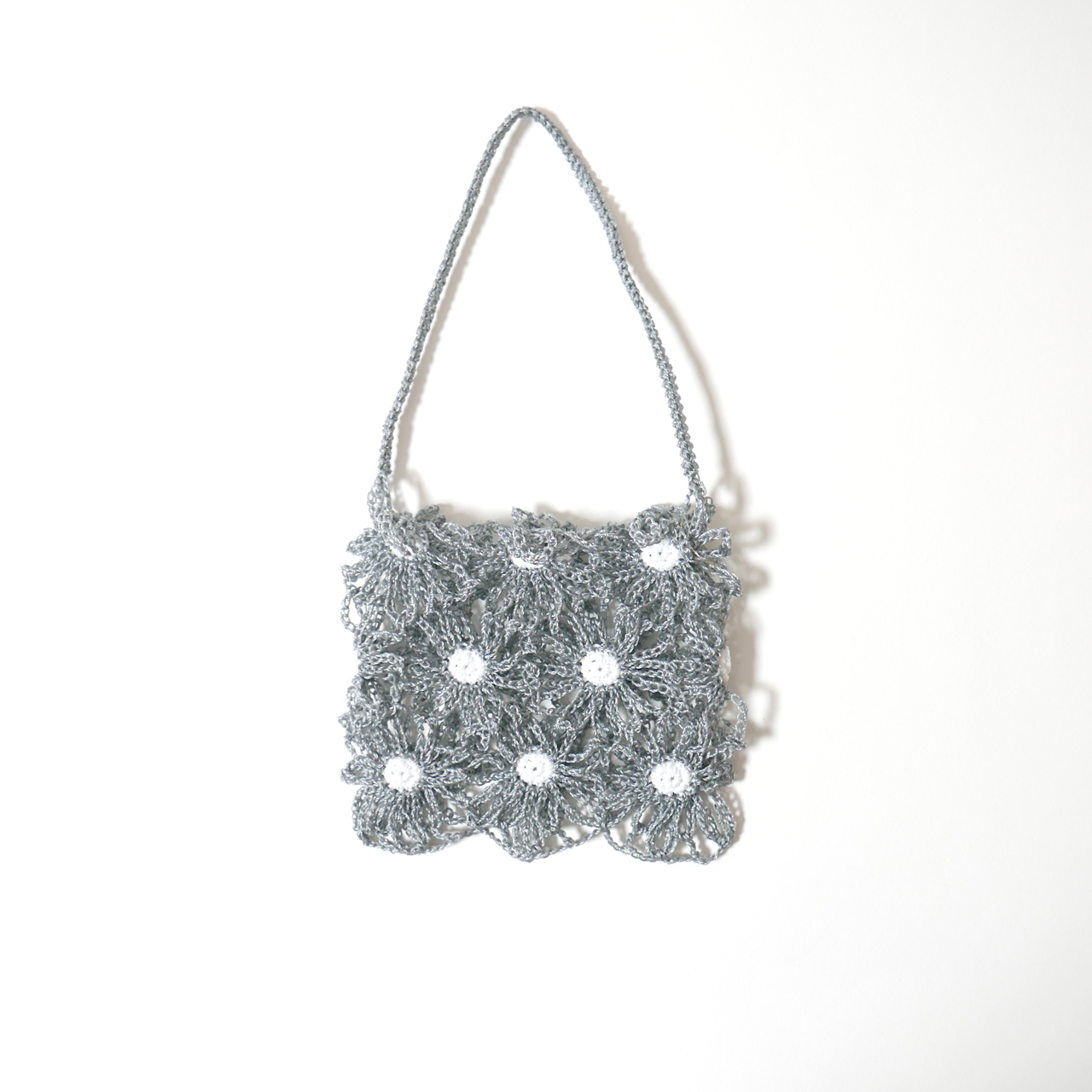 시원해 보이는 메탈릭 그레이 데이지 꽃과 하얀 꽃술의 아름다운 가방입니다.