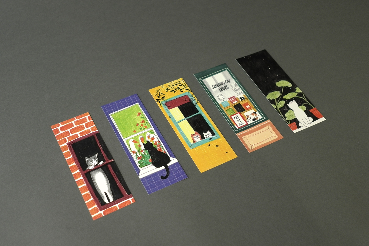 고양이의 다양한 모습과 표정을 그려 넣은 5종의 북마크입니다.