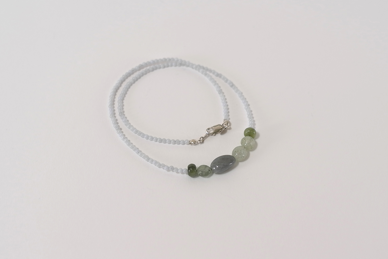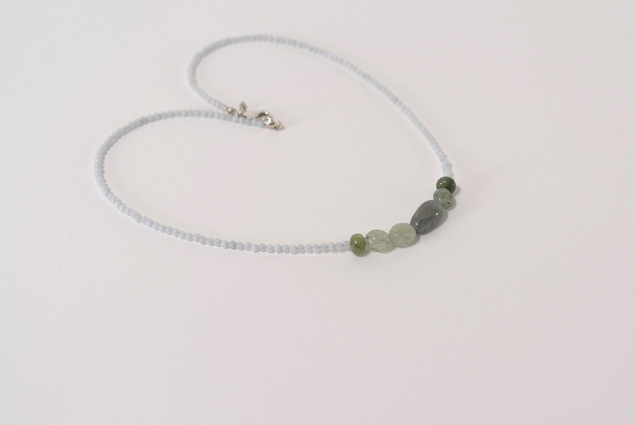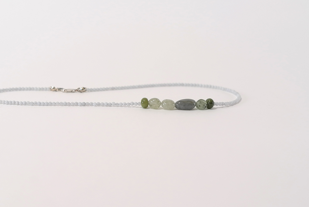 재패니즈 비즈와 비정형의 원석 옥을 엮어 만든 목걸이는