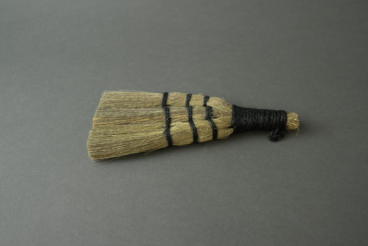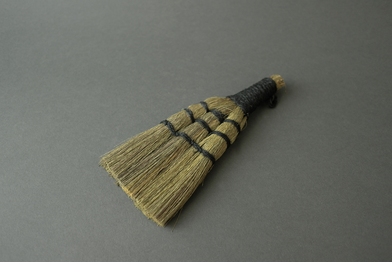 검정 마 끈이 매력적인 작은 싸리 빗자루입니다.